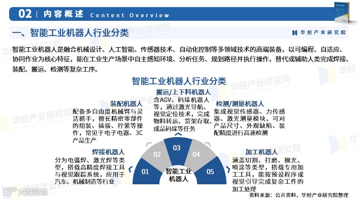 智能工业机器人是融合机械设计、人工智能、传感器技术与自动化控制的高端装备,具备可编程、自适应和协同作业能力,可在工业场景中自主感知环境、分析任务、规划路径并执行焊接、装配、搬运、检测等复杂工序。其具有自我学习、故障诊断与动态调整功能,能无缝对接工厂物联网,实现高效、精准、柔性的智能制造,推动工业生产向自动化、数字化、智能化转型。