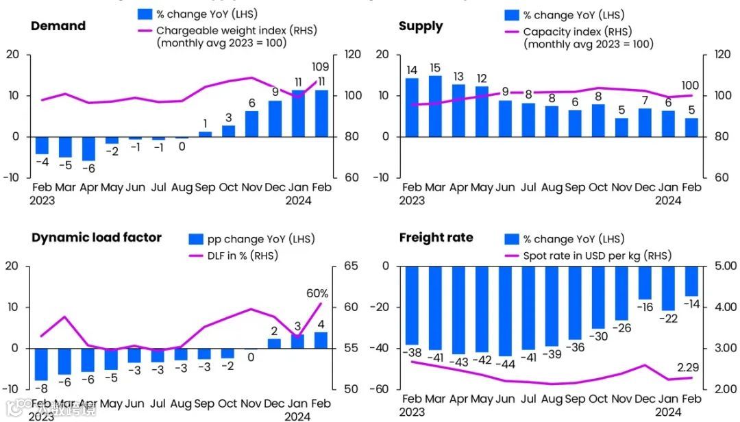 根据WorldACD的数据,今年前两个月的航空货运需求同比增长了13%,如果不计算2月份的额外闰年日,增长率为11%。一般来说,这两个月通常是第四季度旺季和农历新年短暂高峰之后的放缓时期。
