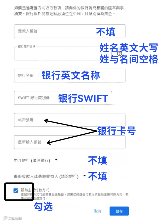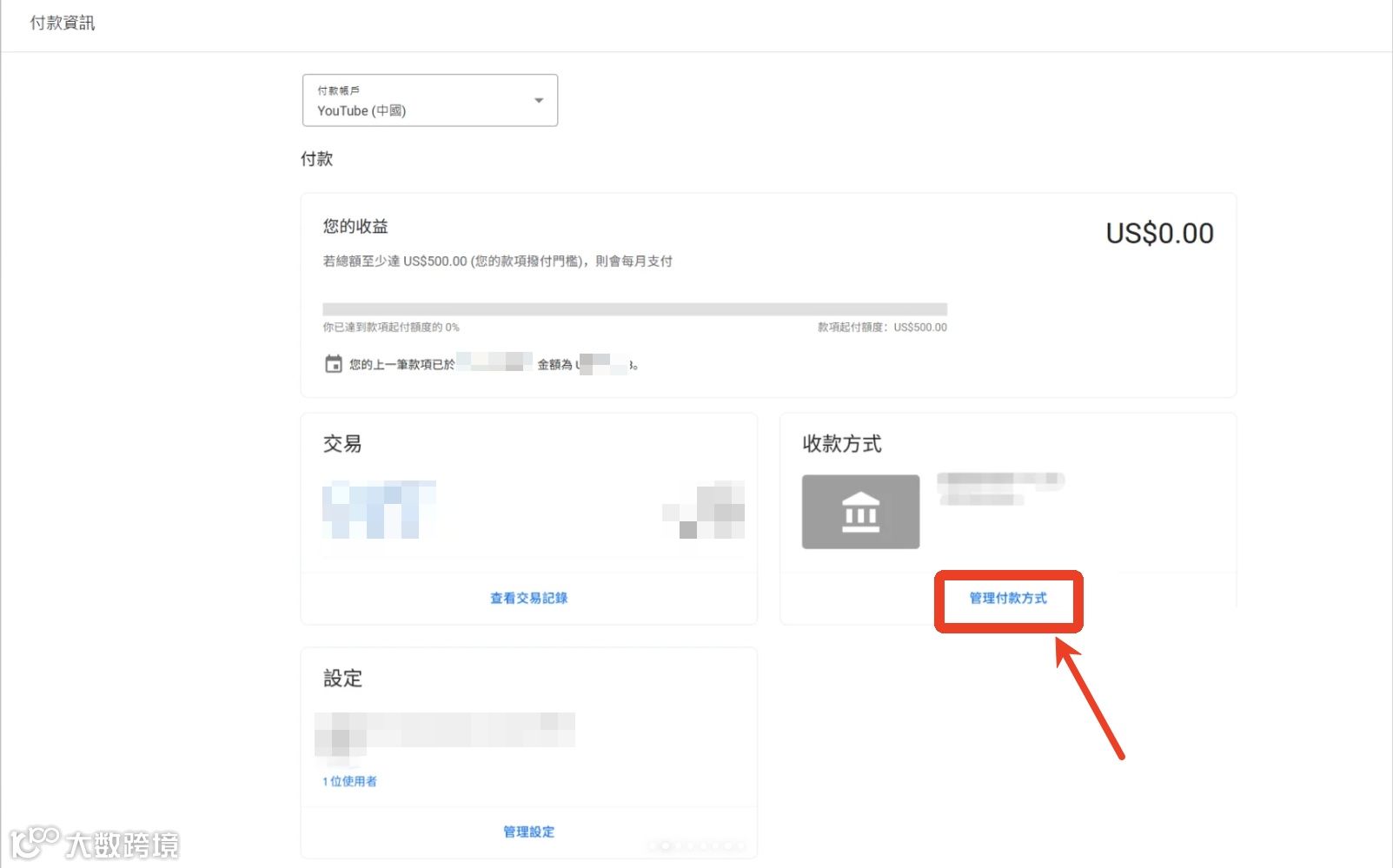 ② 视频收益达到 100 刀后可以提现,此时需要在 AdSense 上填写你的收款方式