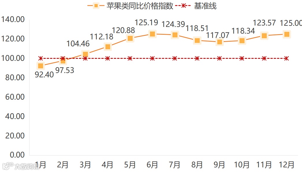 受前期异常气候影响,全国冷库苹果库存量处于近七年低位,加上山东、陕西等核心产区优质果稀缺性凸显,价格整体维持高位,进一步支撑苹果类同比价格指数维持上涨,尤其10-12月指数涨幅再次出现“逐月扩大”趋势,12月达到25.00%,红富士、阿克苏、金帅等同比价格指数涨幅均在20%以上。