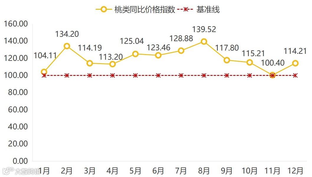 2025年,桃类同比价格指数全年均位于100点以上,整体呈现高位运行态势,其涨势主要由气候异常导致的供给收缩与品质升级驱动的需求增长共同支撑。