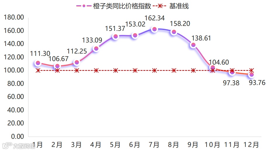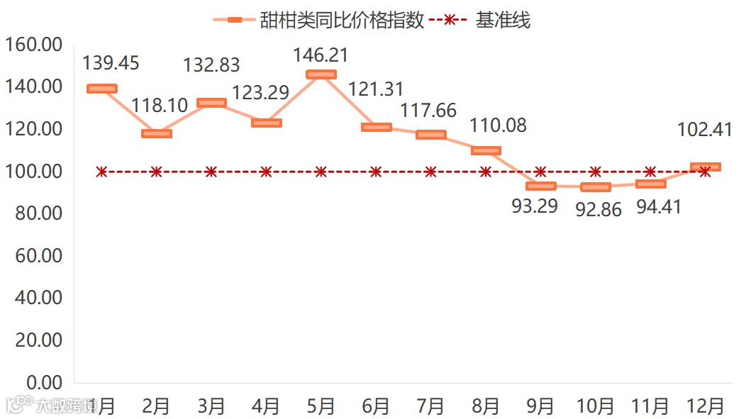 新一季早熟果品开始上市,初期优果率偏低,甜度不足,价格整体走低,而11月新一季果品进入批量上市阶段,随着各品种的种植面积逐年扩大、产量提升,贡柑、沃柑等品种价格承压,指数维持下行趋势,甜柑类同比价格指数均在93点上下波动。