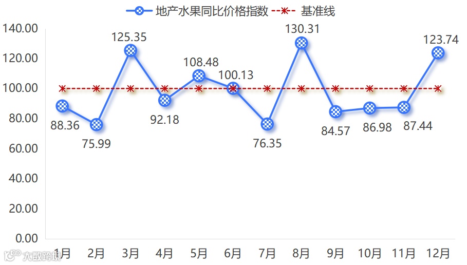2025年,嘉兴水果市场同比价格总指数以涨为主。其中上半年指数均保持105.00点以上,4月达到全年峰值120.90点。下半年指数涨跌各半,其中最大跌幅出现在12月,指数收于96.60点,跌幅为3.40%;最大涨幅为8月的12.70%。