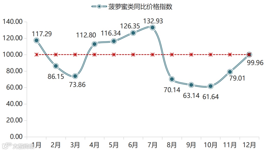 新一季菠萝蜜丰产,越南产量大幅提升,市场供应充足,价格持续低于上年同期水平,且8-10月期间指数跌幅逐渐扩大,至10月跌至全年最低点61.64点,跌幅达38.36%。