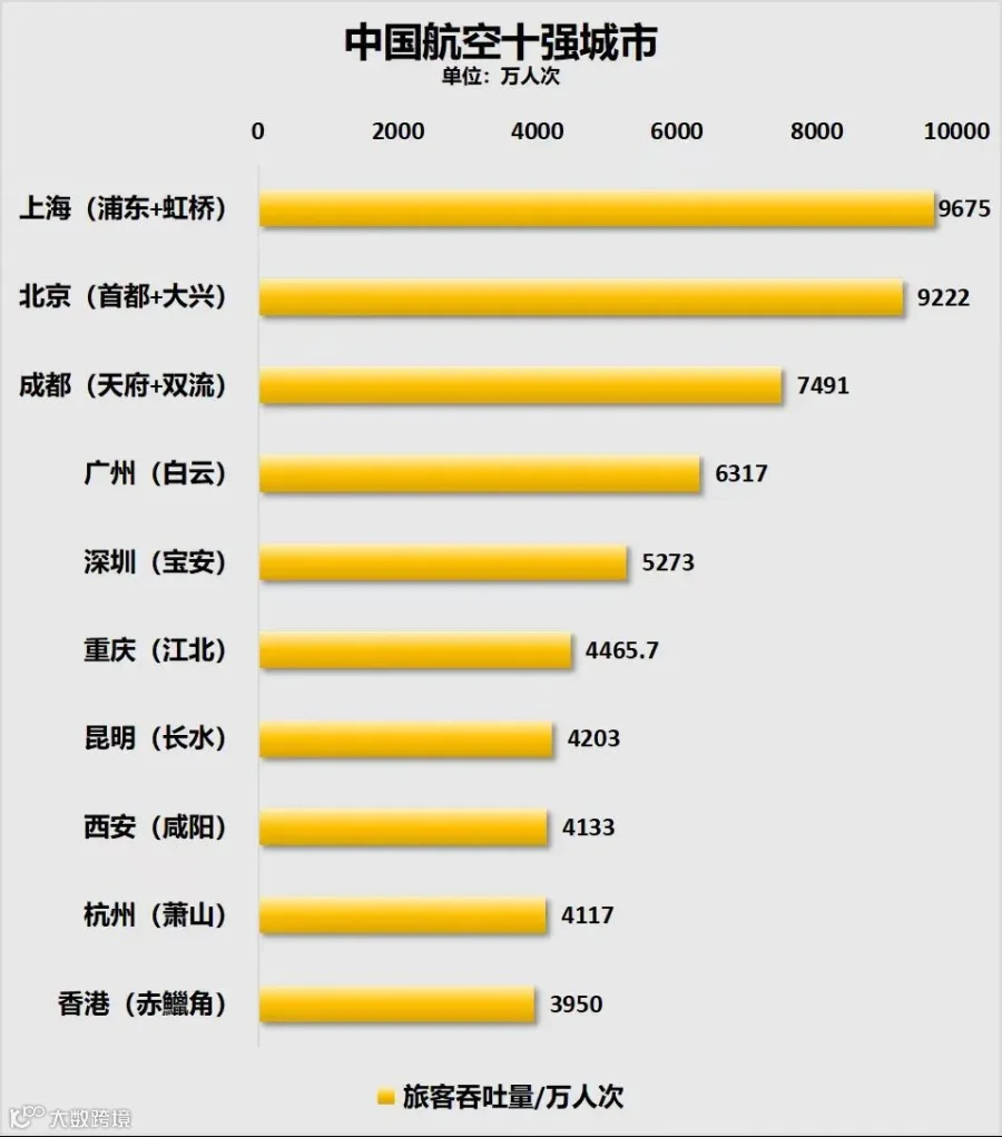 若从航空流量看,前五个城市,应该都不意外。根据2023年的数据,上海、北京、广州之外,成都、深圳、重庆、昆明、西安,都进入了全国航空旅客吞吐量前八强。