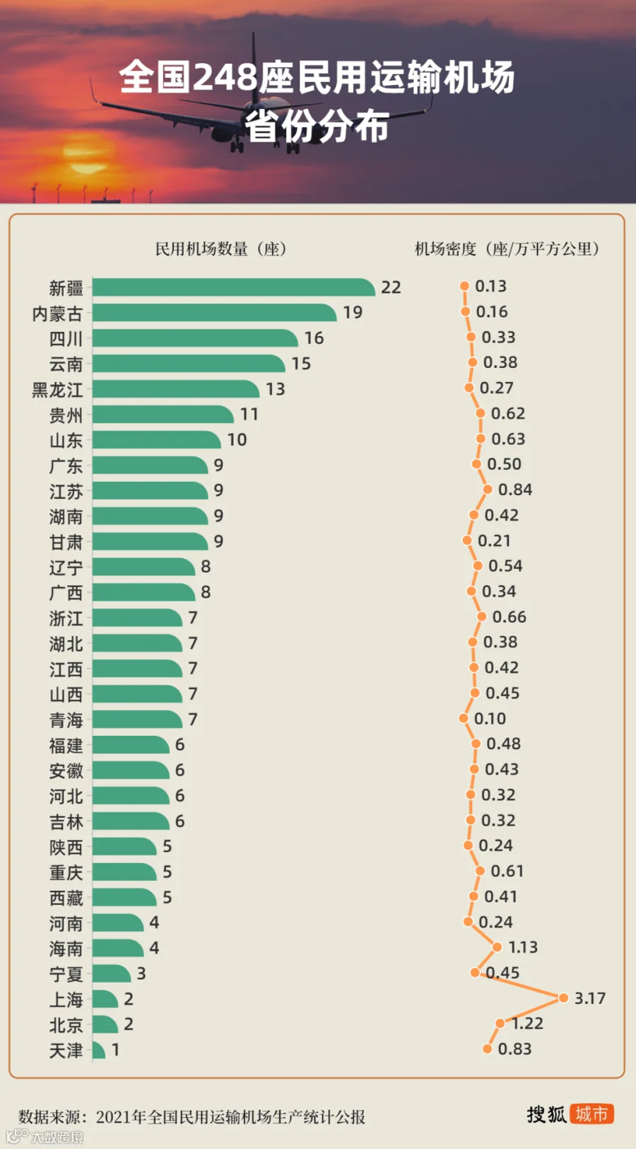 从区域分布看,新疆、内蒙古、四川、云南的机场数量在15座以上。
