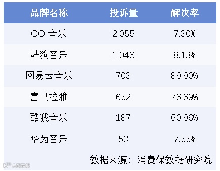投诉榜上QQ音乐居首,解决率仅7.3%