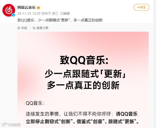 网易云音乐在长文中直指QQ音乐抄袭其播放器“DIY功能”,并列举黑胶界面、“一起听”、故宫联名播放器等多项“借鉴式创意”,呼吁QQ音乐停止“剽窃式创新”。
