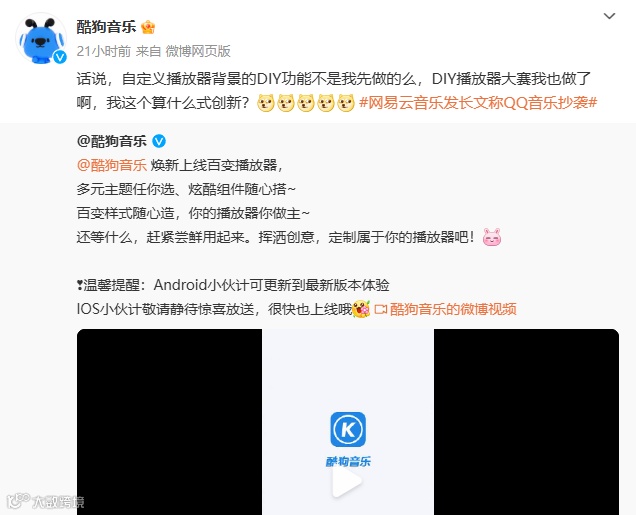 事件发酵后,同属腾讯音乐娱乐集团的酷狗音乐率先回应,晒出2023年10月发布的自定义播放器视频,质疑“DIY功能”首创权归属。
