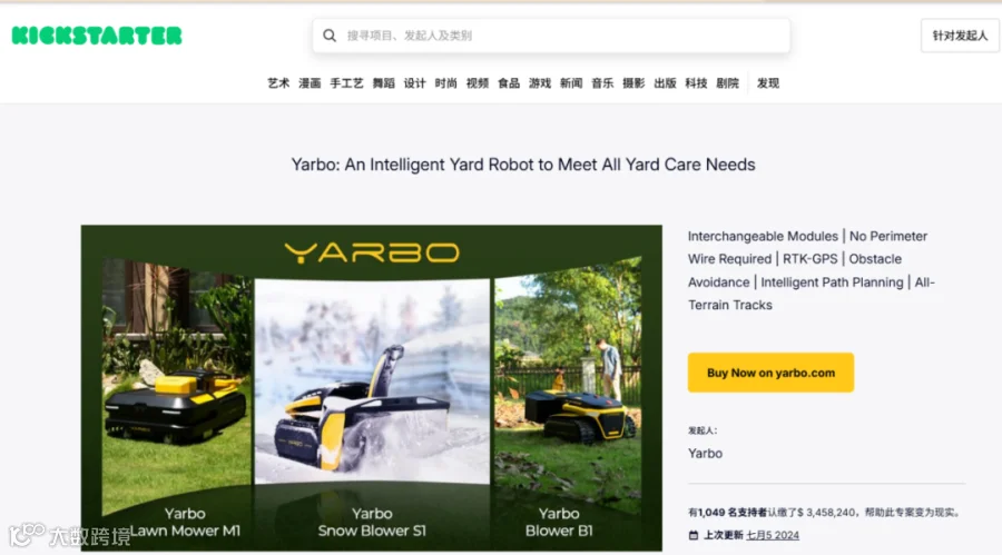 图源:Yarbo此外,通过在Kickstarter上进行众筹,创下了345万美元的消费级机器人众筹纪录,快速积累了种子用户并有效测试了市场反应。