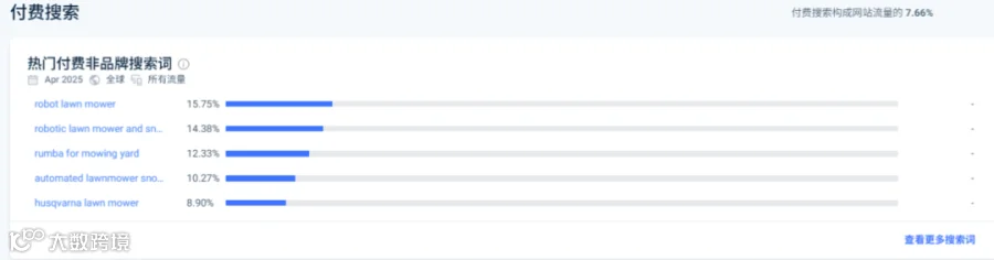 在自然搜索和付费搜索中,热门关键词如“robot lawn mower”、“robotic lawn mower and snowblower”等搜索量较大,表明该独立站在相关领域的关键词优化做得较好,能够吸引大量相关流量。