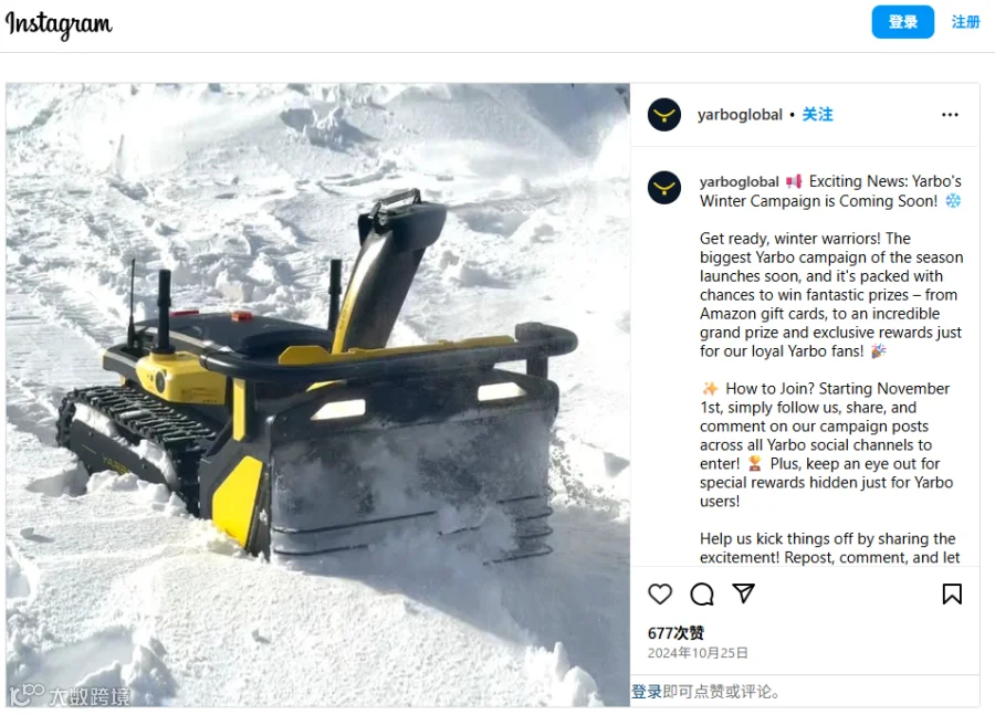 针对高客单价、低复购的品类特性,Yarbo在Instagram、Facebook等平台推出了“雪季挑战”等互动活动,鼓励用户转发视频并分享使用体验,参与者有机会赢取模块配件。