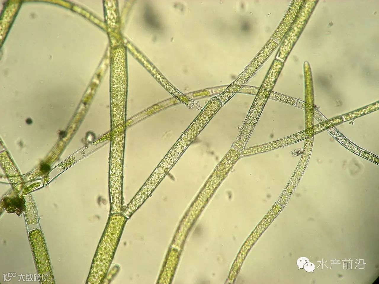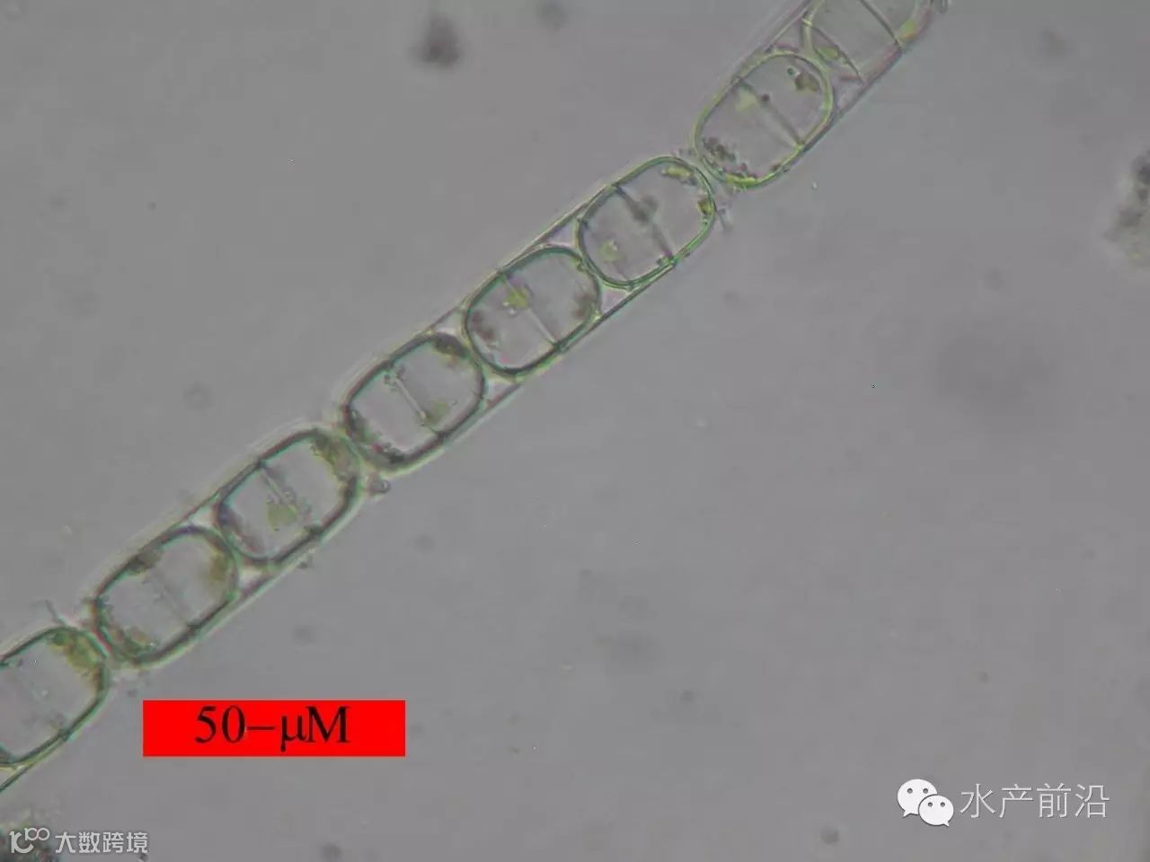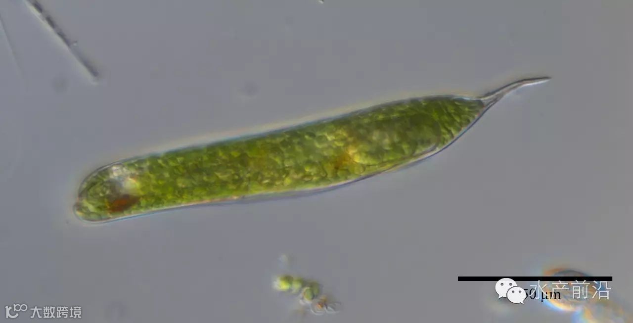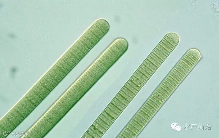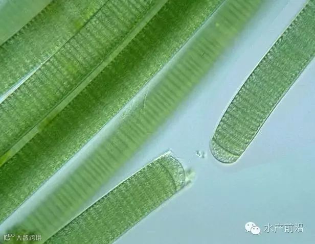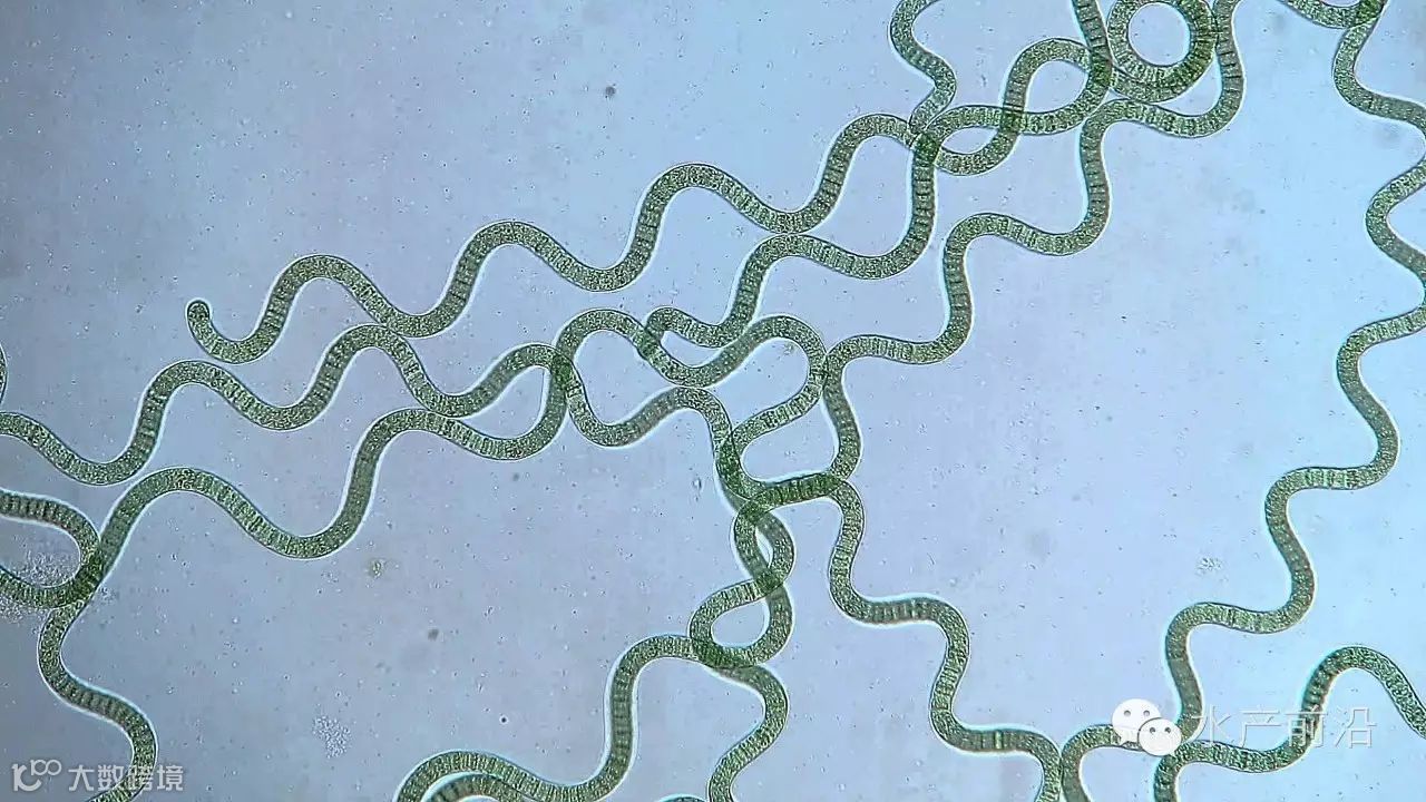 颤藻(Oscillatoria)为丝状蓝线菌,具黏液鞘,在水中呈有节奏颤动而得名。分布广泛,生命力强,全年均可生长。细胞直径较大,可达70μm,为最常见的蓝藻之一。