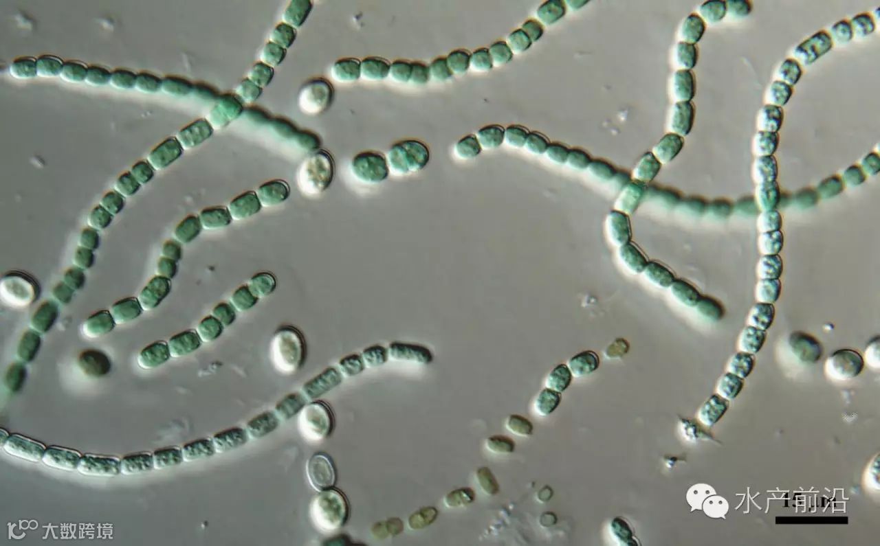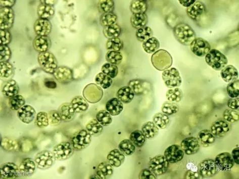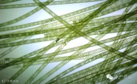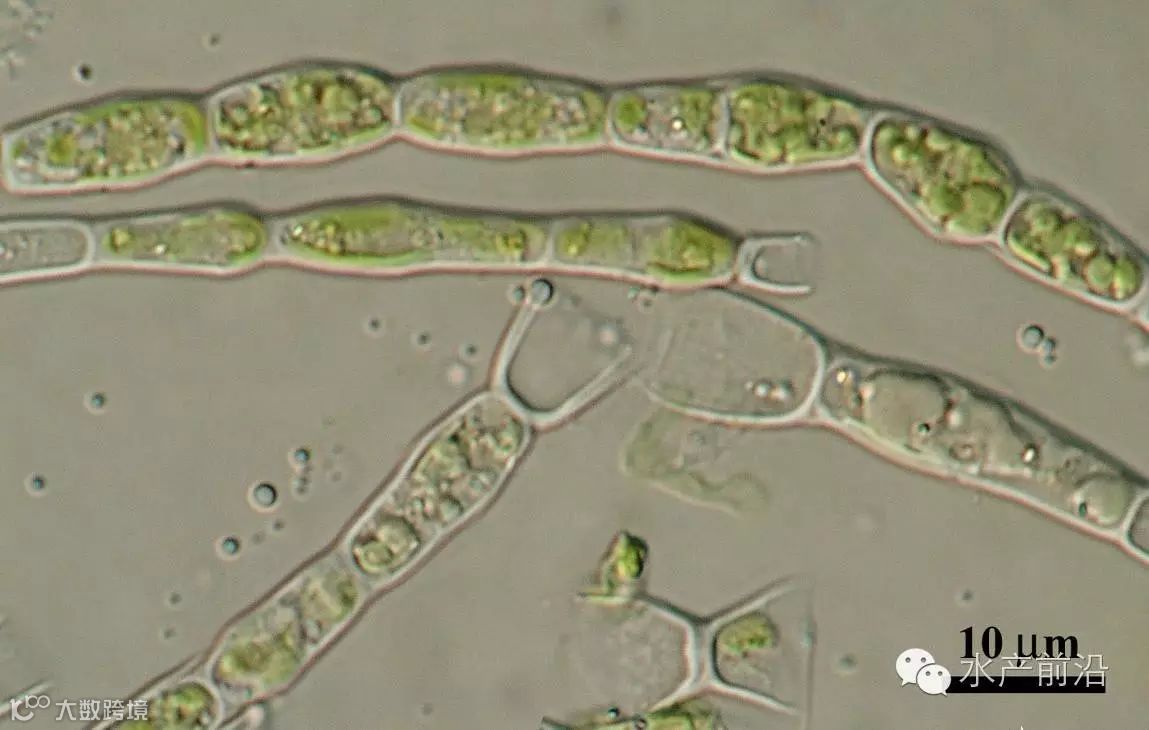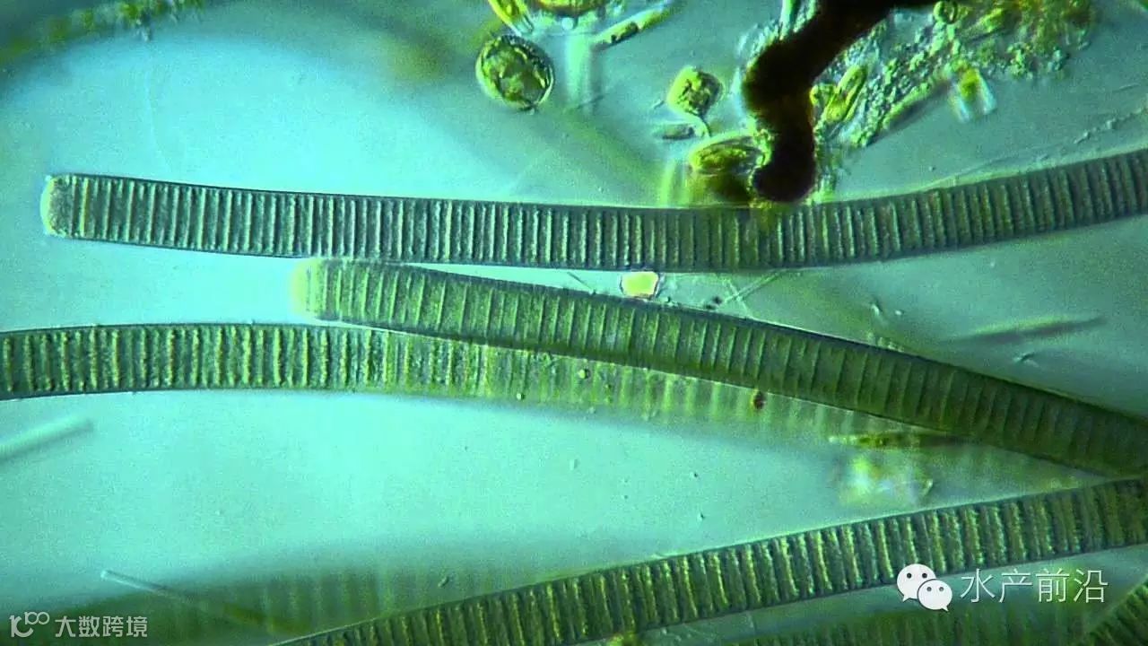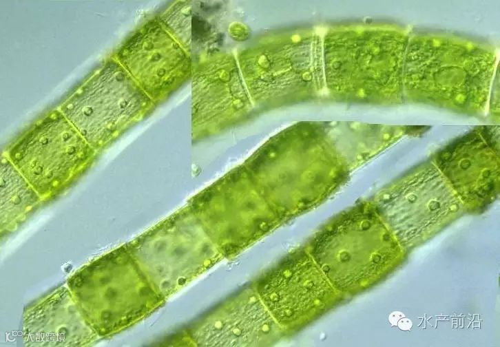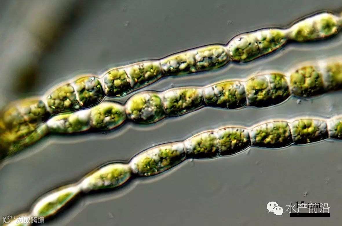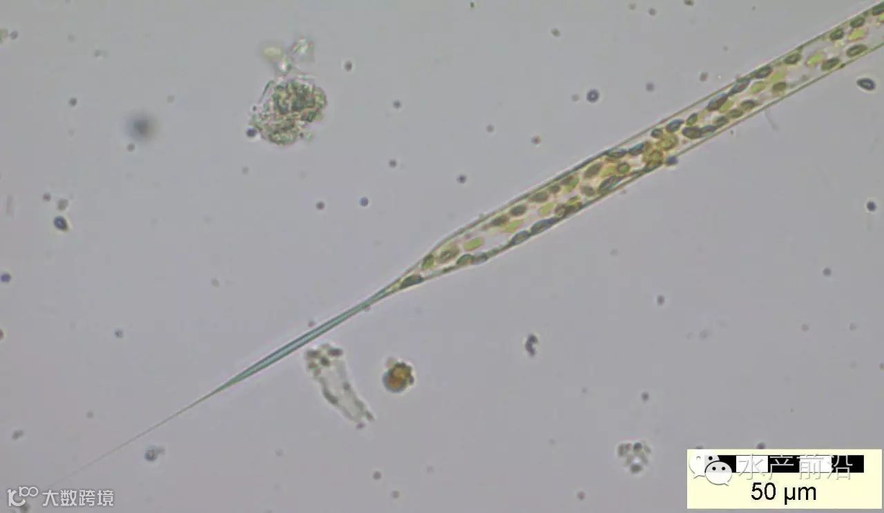 颤藻(Oscillatoria)为丝状蓝线菌,具黏液鞘,在水中呈有节奏颤动而得名。分布广泛,生命力强,全年均可生长。细胞直径较大,可达70μm,为最常见的蓝藻之一。