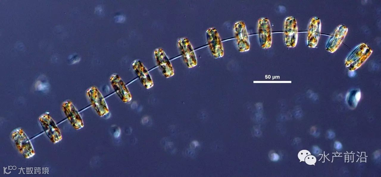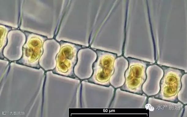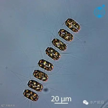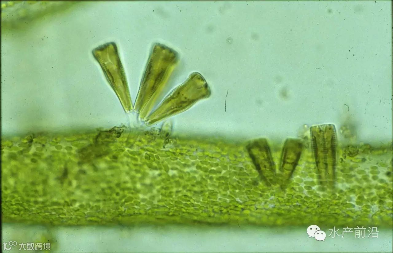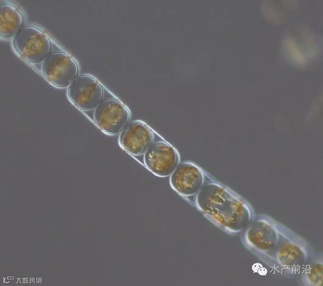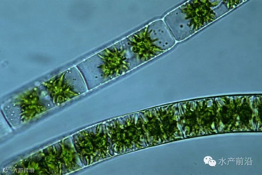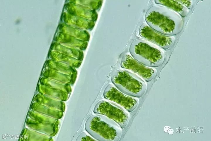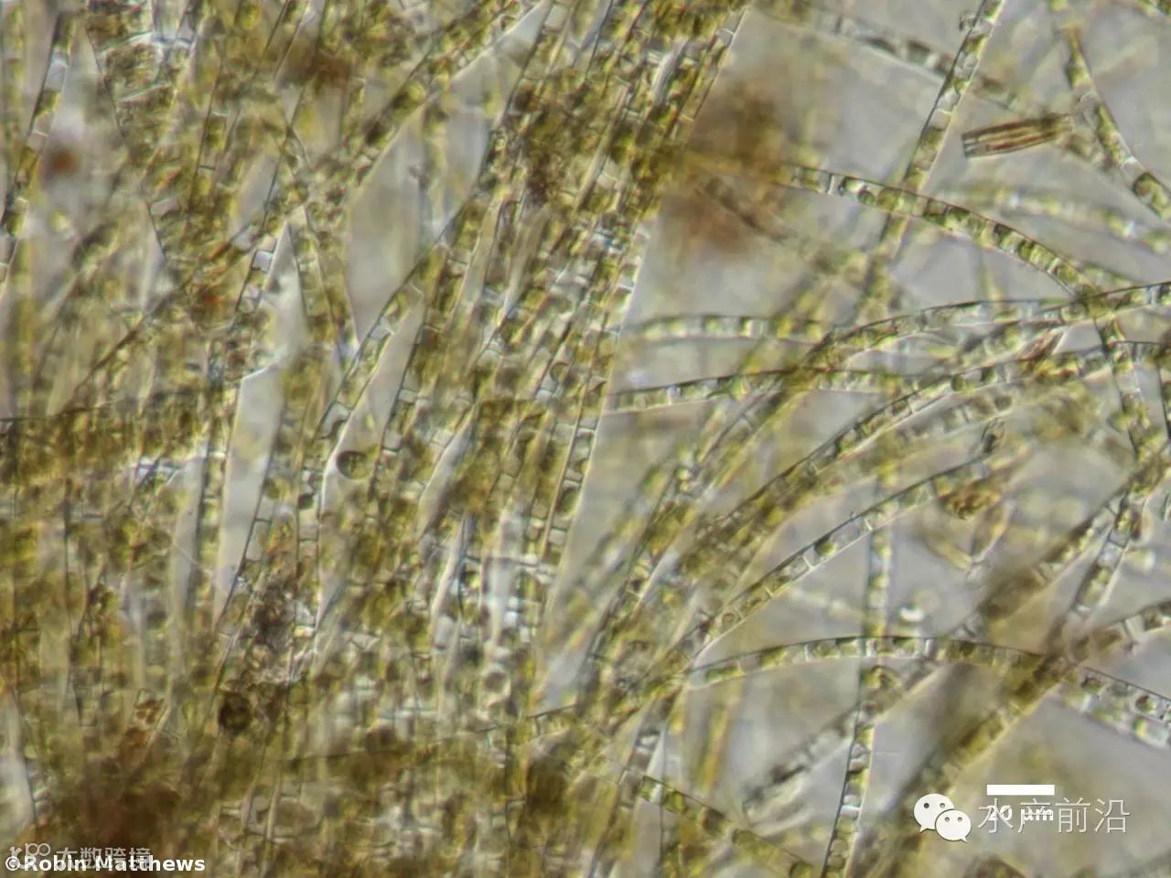 颤藻(Oscillatoria)为丝状蓝线菌,具黏液鞘,在水中呈有节奏颤动而得名。分布广泛,生命力强,全年均可生长。细胞直径较大,可达70μm,为最常见的蓝藻之一。
