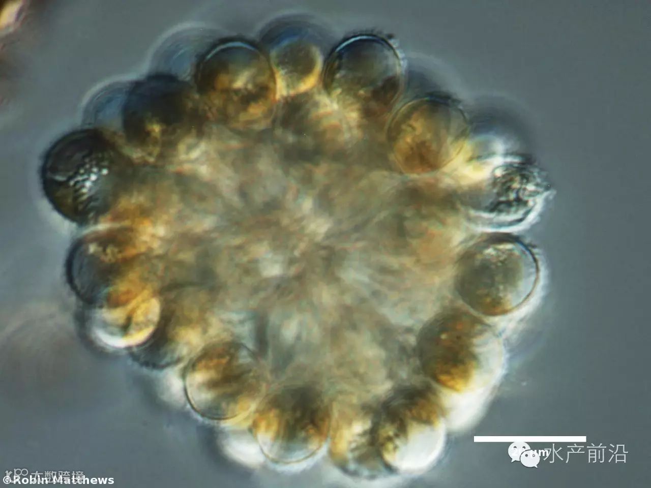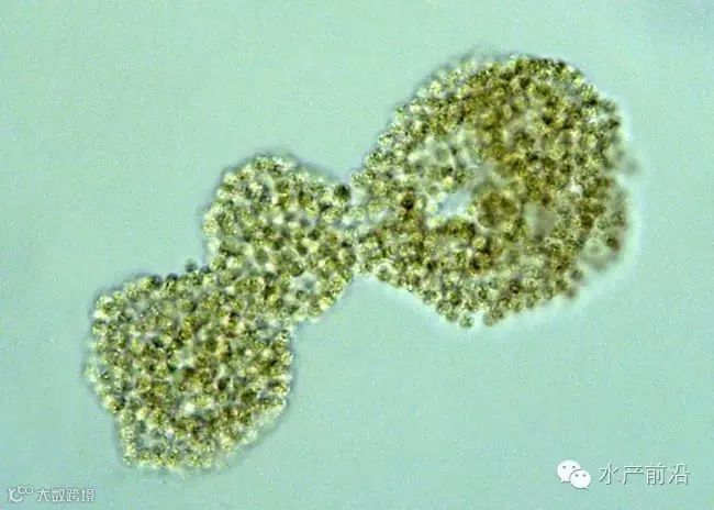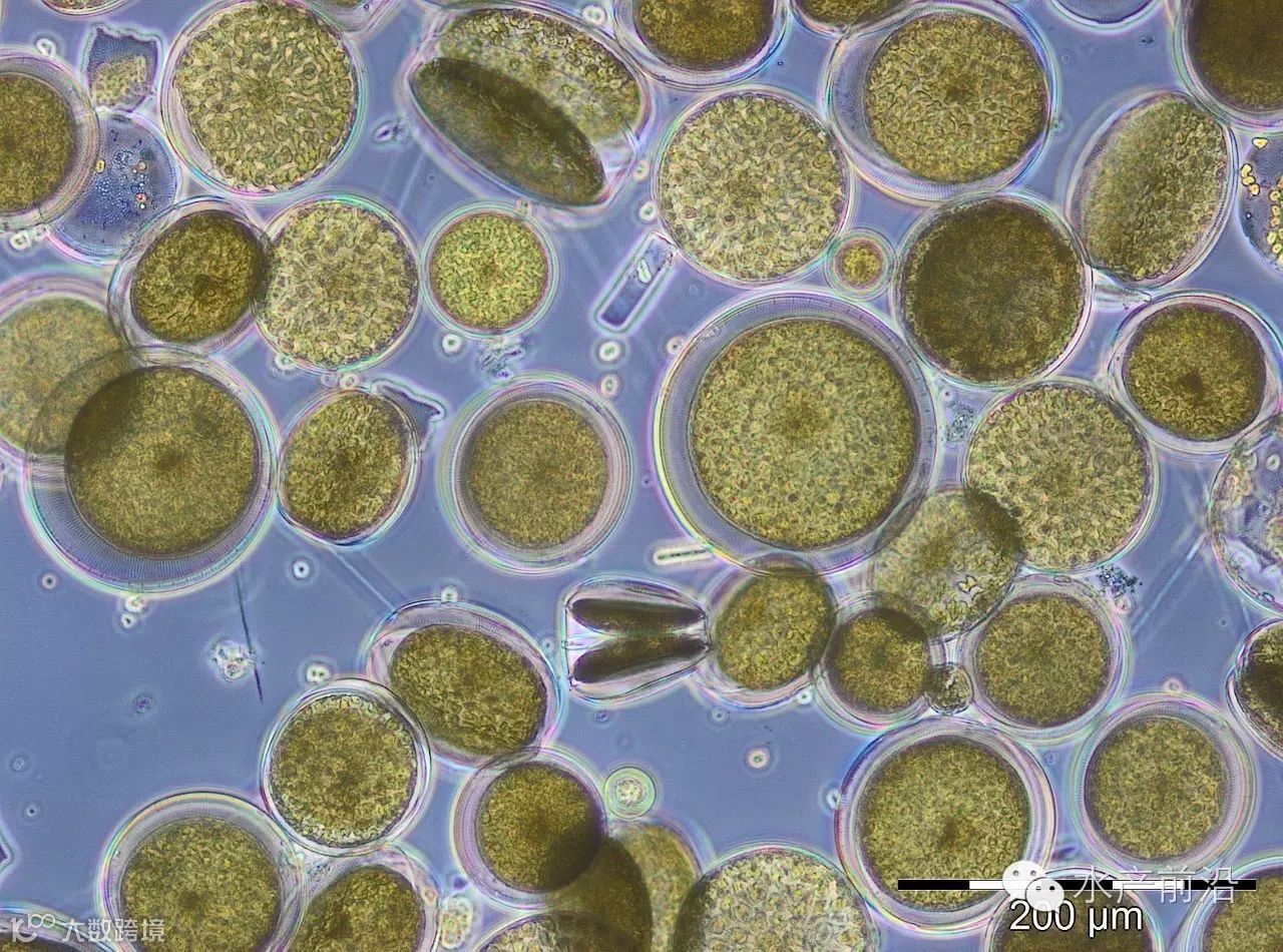 微囊藻(Microcystis)是淡水常见的蓝菌属,其中铜绿微囊藻可引发有害藻华,其毒素对肝脏和胆囊具有损害作用。细胞无鞘包裹,常聚集成肉眼可见的群落,初期呈圆形,随细胞增多逐渐出现孔洞并变得不规则。原生质体为浅蓝绿色,因含气囊泡在显微镜下呈现暗色斑点,是重要鉴别特征。