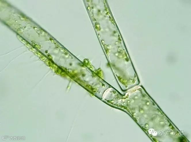 刚毛藻(Cladophora)为多细胞丝状体,可分支或不分枝。细胞长筒形,具厚细胞壁和多个细胞核。广布于淡水、半咸水及海水,中国黄海、渤海常见。为高pH水体的指示植物。