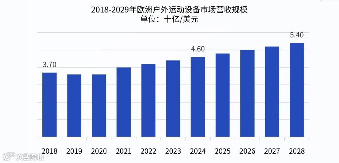 登山、骑行、飞盘、极限运动等户外活动的兴起,让欧洲消费者对运动用品的需求日益丰富。预计到2028年,欧洲户外运动设备销售收入将达54亿,行业发展呈现持续稳定的增长态势。