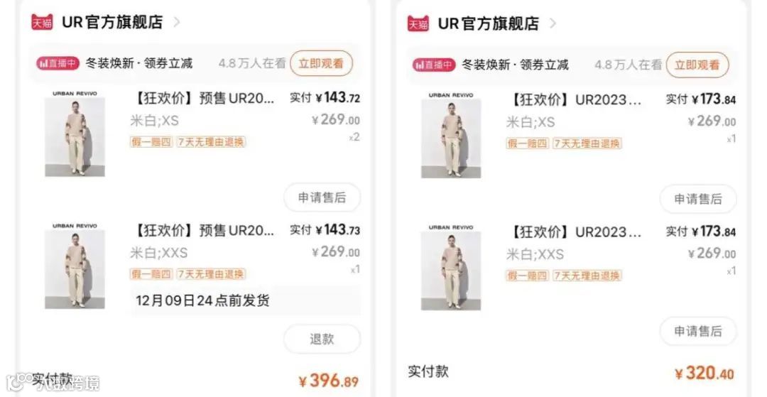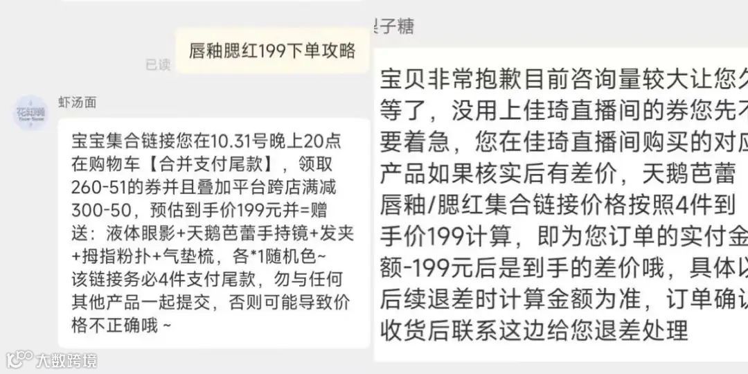 “我今年买了花知晓的口红和腮红,按照主播给出的机制是4件券后199元,且主播还建议付尾款时,最好只付这4个产品,否则拼单后可能会影响低价。”雨辰介绍道,“但因为忘记去领品牌券,最终没享受到‘史低’,还好花知晓表示最后会退差价,否则我真的可能会整单退款。”