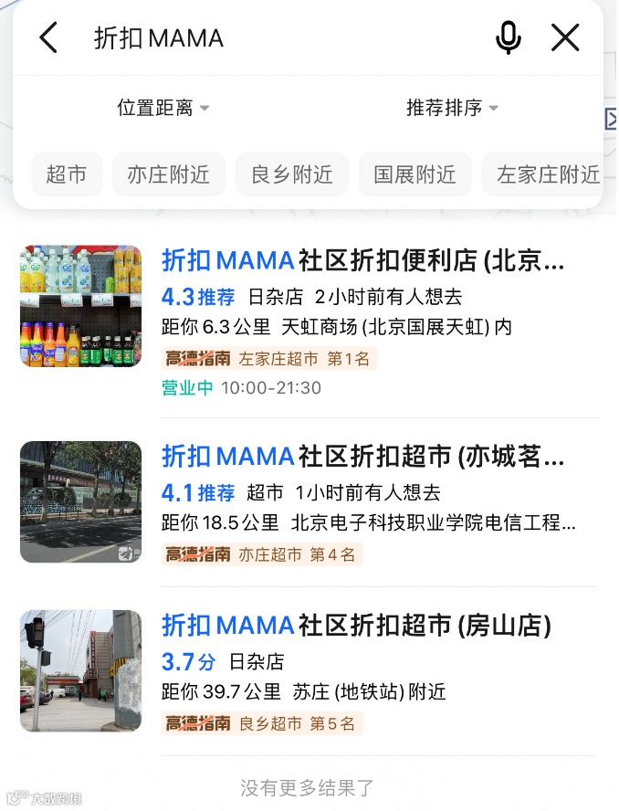高德地图显示折扣MAMA在北京有三家门店