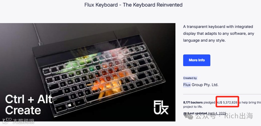 2023年,Flux在Kickstarter上推出全新Keyboard项目,成功筹集约2700万人民币(537万澳元)资金。该产品通过将可触感的Maglev磁悬浮键轴与全键OLED/IPS屏幕融合,实现了“看得到、摸得着”的动态按键体验。