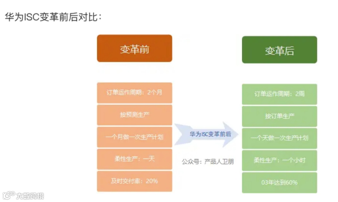 (图:华为ISC变革成果,来源:产品人卫朋)供应链变革之后,华为从上游的原料采购、到生产、再到下游的销售、渠道实现了一体化联动,整个公司的市场响应速度和管理运作变得敏捷,并且产品质量和成本也在供应链的把控下得以精进和优化,这为未来华为的全球化奠定了基础和方法论。