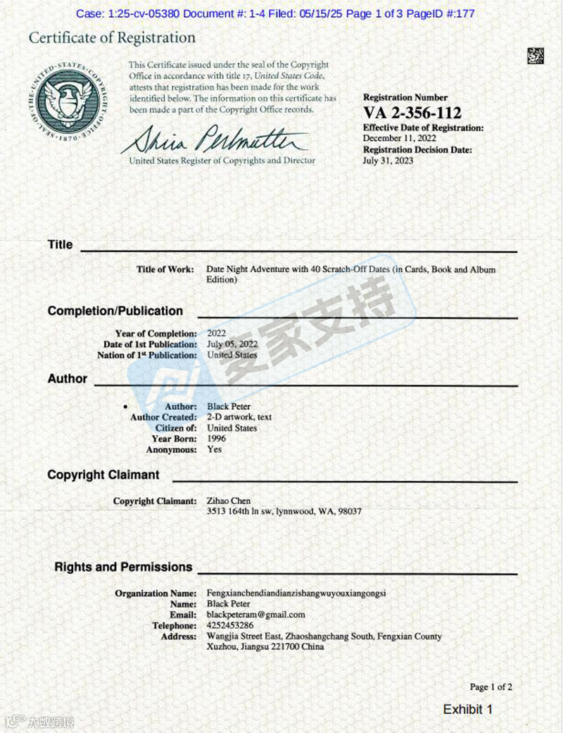 本案是Avek 律所代理国人卖家Fengxian Chendian Elecnic Commerce Co., Ltd.跨境发起的维权,涉及商标和版权两个维度的维权,涉案商标为:Date Night Adventure,商标号:7649725和Date Night Adventure游戏卡片设计版权图,该版权于2022年12月11日下证版权证书,版权号为:VA0002356112,涵盖文字、图片等多个维度!目前本案已递交TRO临时限制令申请,暂未获批,跨境卖家速查下架。