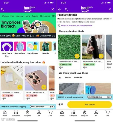 物流方面,Haul 平台支持包邮,满25美元免运费,否则运费为3.99美元。这个策略很明显是瞄准美国消费者对“性价比”和“便捷”的双重需求。相比亚马逊主站上的商品,Haul 更像是“低价专区”或者“亚马逊版的拼多多”,主打的就是一个“便宜好买”。这个举动,明显是为了吸引对价格敏感的消费者,避免他们流向 Temu、Shein 等新兴平台。