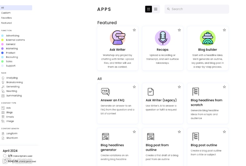Writer提供了一种称为“应用”的功能系统。这些应用整合在Web平台中,提供了多种强大功能,帮助用户高效完成不同的写作任务。比如,“Blog Builder”(博客生成器)能根据一个标题想法快速生成博客文章;“Recaps”功能可以将录音内容转换成关键要点总结;而“Ask Writer”则是一个与ChatGPT类似的聊天式提示生成系统。除此之外,Writer还提供了生成产品描述、推送通知以及帮助中心文章的功能。