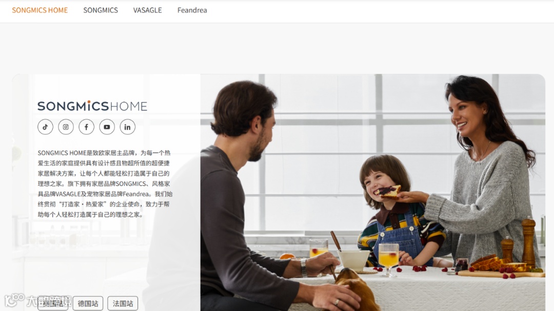 旗下拥有家居品牌SONGMICS、风格家具品牌VASAGLE及宠物家居品牌Feandrea三大自主品牌,产品遍布欧洲、北美、日本等地区。