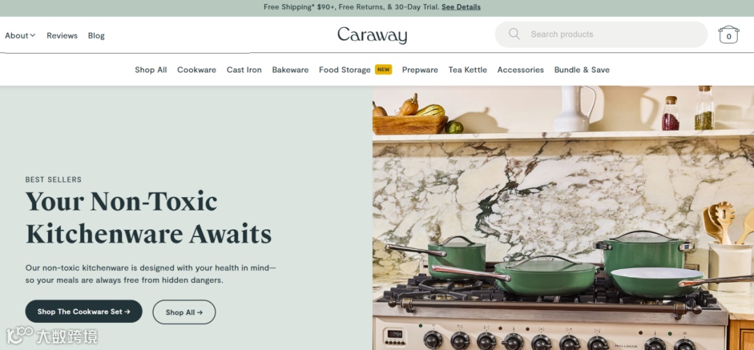 图源:Caraway2019年,Caraway创始人Jordan Nathan在某次做饭时,意外出现不粘锅特氟龙涂层中毒事件,而市面上并无完全安全可靠的厨具。Jordan决定以“环保安全无毒”为核心卖点,精准填补厨具市场空白,差异化定位切中消费者在食品安全环保上的痛点关注。