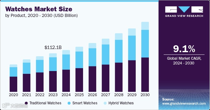 2023年,全球钟表市场规模达1121亿美元,预计2024年至2030年的复合年增长率将达到9.1%。