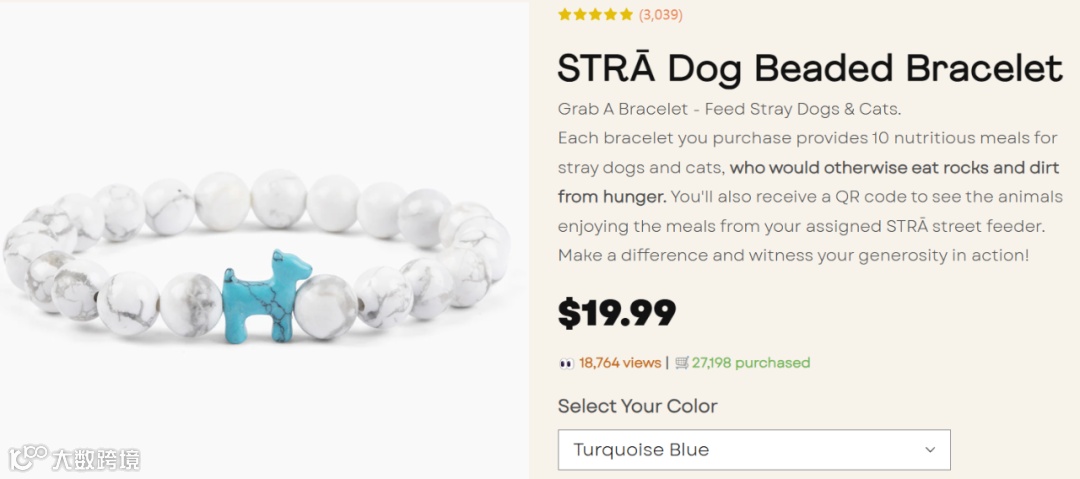 图源:iHeartDogsiHeartDogs上线的首款产品是一条串珠手链,该款手链由22颗珠子组成,每颗珠子分别象征着不同的含义,以此来慰藉失去宠物的亲人,单品售价为19.99美元,累计评论超3000条,是该独立站最畅销的产品之一。