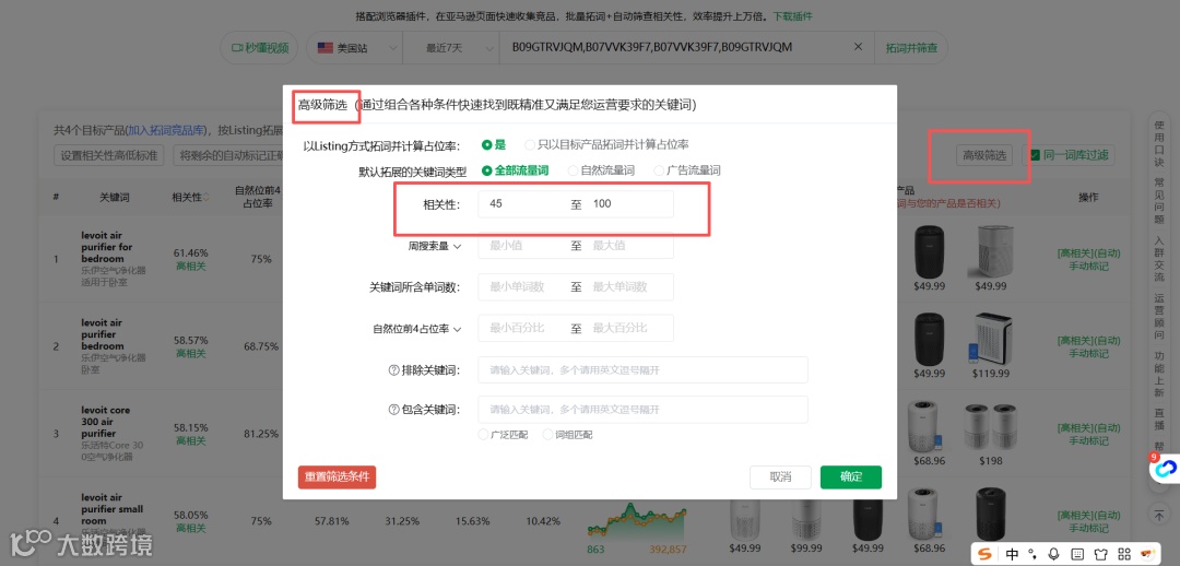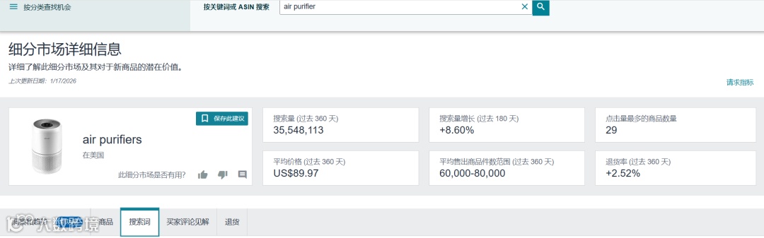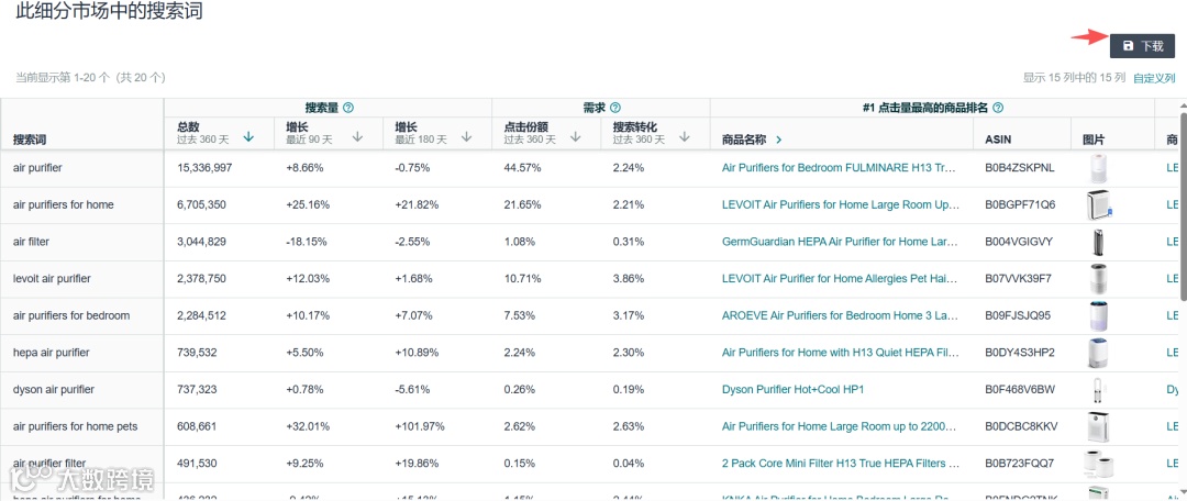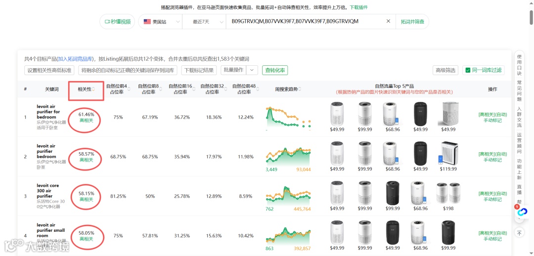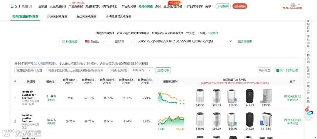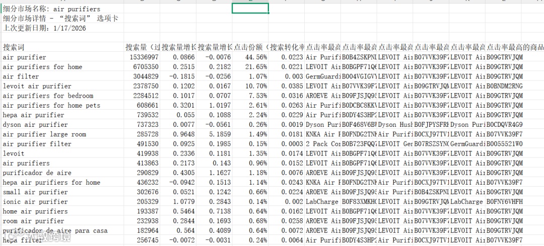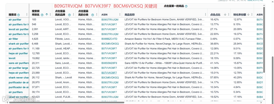 Air Purifier),拉取所有带排名的同类词根词; - 竞对ASIN反查:锁定类目Top 5竞对ASIN,直接获取其正在获取的流量词。