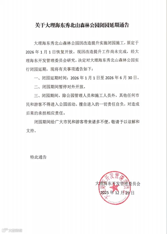 关于大理海东秀北山森林公园闭园延期通告