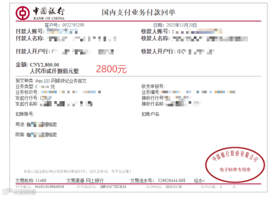 补偿金额:贰仟捌佰元整(小写:2800元)