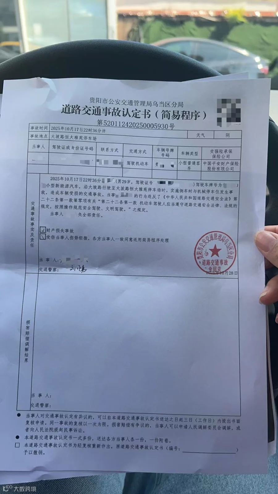 事故地点:贵州省/贵阳市/乌当区 大坡路恒大雅苑停车场