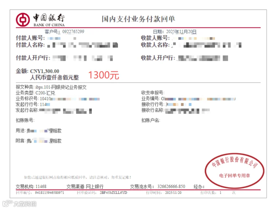 补偿金额:壹仟叁佰元整(小写:1300元)