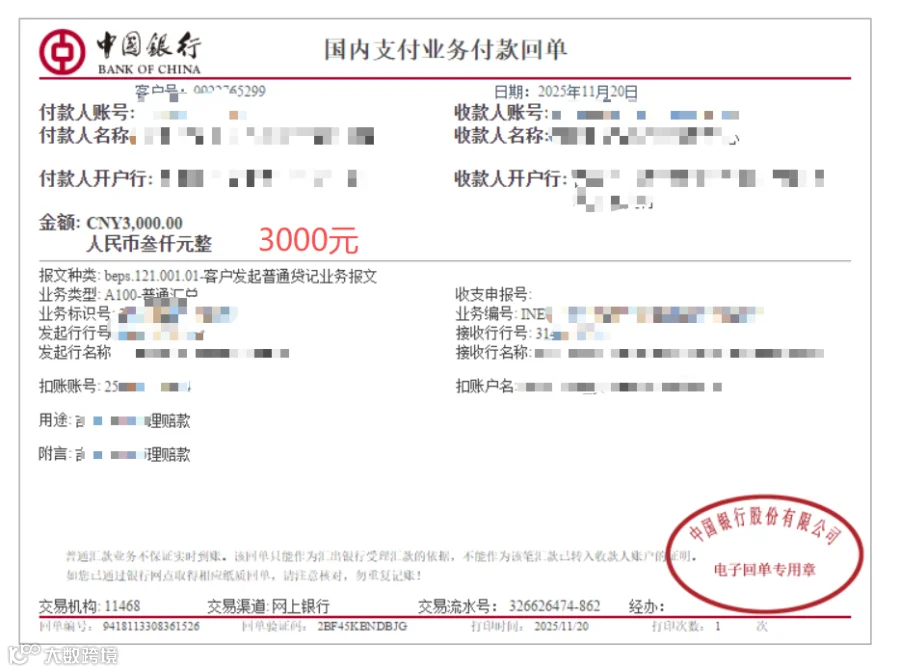 补偿金额:叁仟元整(小写:3000元)