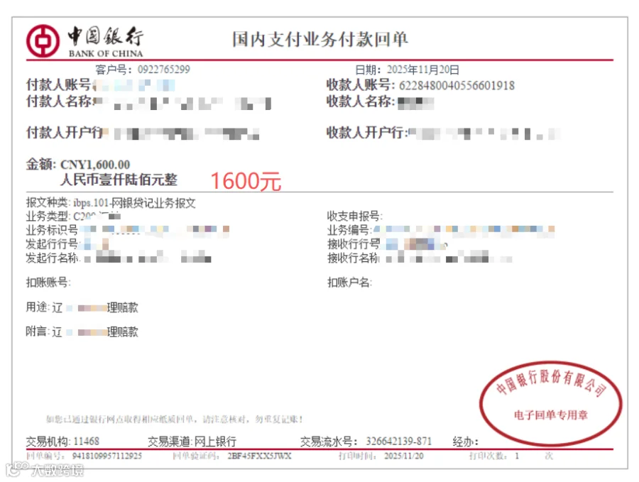 补偿金额:壹仟陆佰元整(小写:1600元)