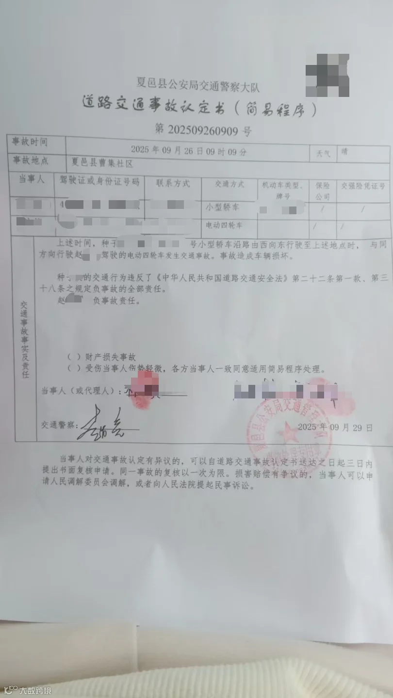 2025年09月26日09时09分,种**驾驶豫A******号小型轿车沿路由西向东行驶至夏邑县曹集社区时,与同方向行驶赵**驾驶的电动四轮车发生交通事故,事故造成车辆损坏。种**的交通行为违反了《中华人民共和国道路交通安全法》第二十二条第一款、第三十八条之规定,负全部责任。赵**不负事故责任。
