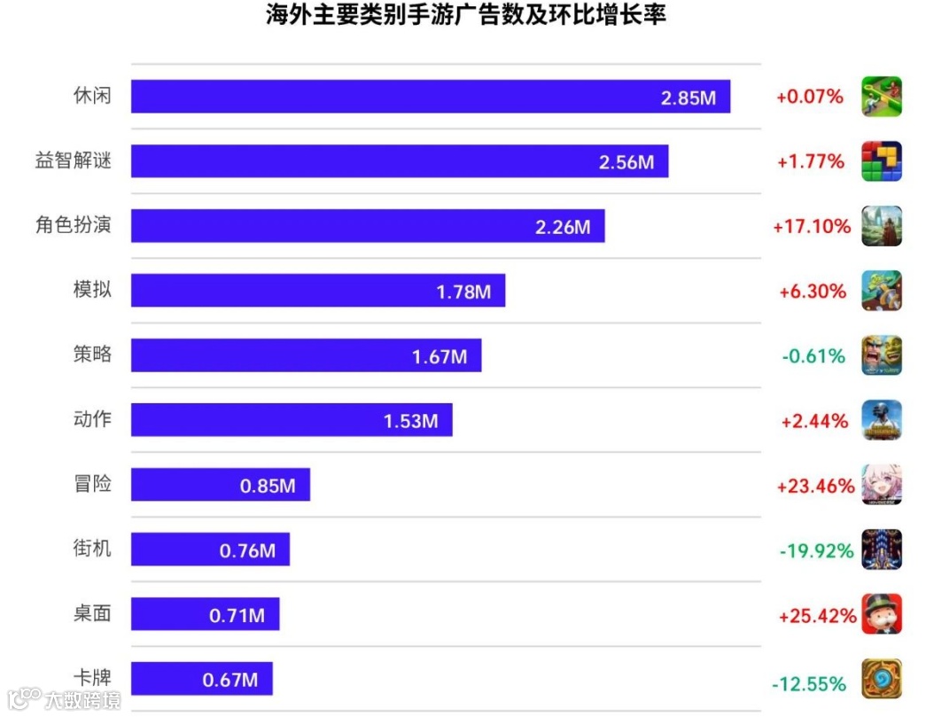 根据 AppGrowing 发布的白皮书,截至 2024 H1,虽然全球手游市场中休闲类和益智类产品依然是广告投放主力,但随着《菇勇者传说》《出发吧麦芬》等一系列轻量化中重度产品的出现,RPG 手游广告数环比增长超过 17%,在很大程度上影响了移动应用广告的投放趋势。
