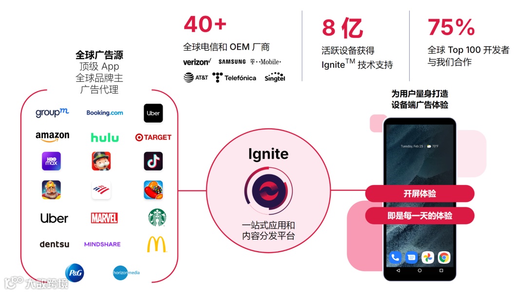 DT 作为最大的海外安卓预装平台,基于和 Verizon,Telefonica 等运营商,以及小米、三星等全球手机厂商(OEM)的紧密合作,已能够在全球超过 8 亿+ 设备上实现应用的直接下载,包括系统更新、工厂预装等。