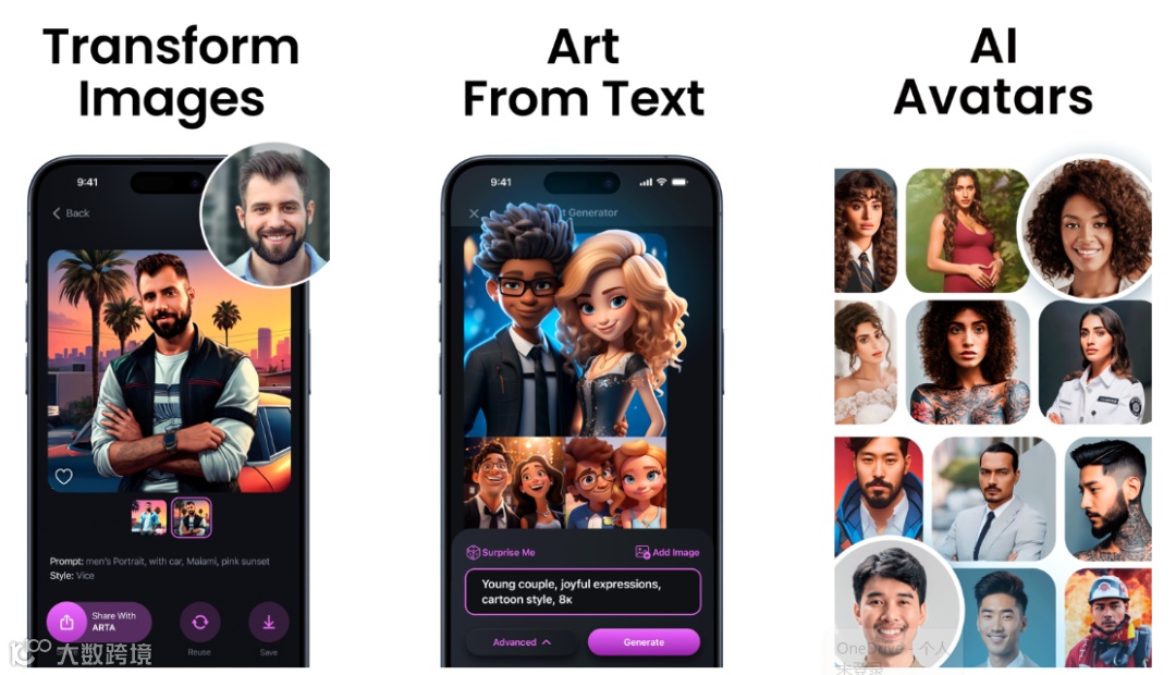 在玩法上,AI Photo Generator吸取了大量图形设计类产品的火爆玩法,比如各种AI滤镜,AI场景设计等等。