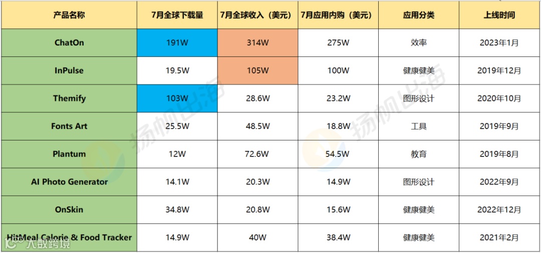 inPulse领衔的三款健康健美类应用在下载和收入上表现不错,但三款应用单月收入之和,也不及ChatOn的一半。