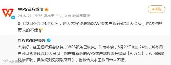 3.WPS官方对于此次宕机事故进行了回应:经工程师紧急修复,WPS服务已恢复。