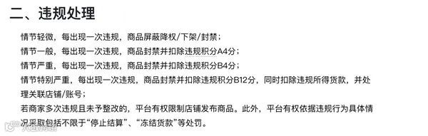 对于情节特别严重的违规行为,每出现一次违规,抖音电商将把商品封禁并扣除违规积分B12分,同时扣除违规所得货款,并处理关联店铺/账号。若商家多次违规且未予整改的,平台有权限制店铺发布商品。此外,平台有权依据违规行为具体情况采取包括不限于“停止结算”、“冻结货款”等处罚。