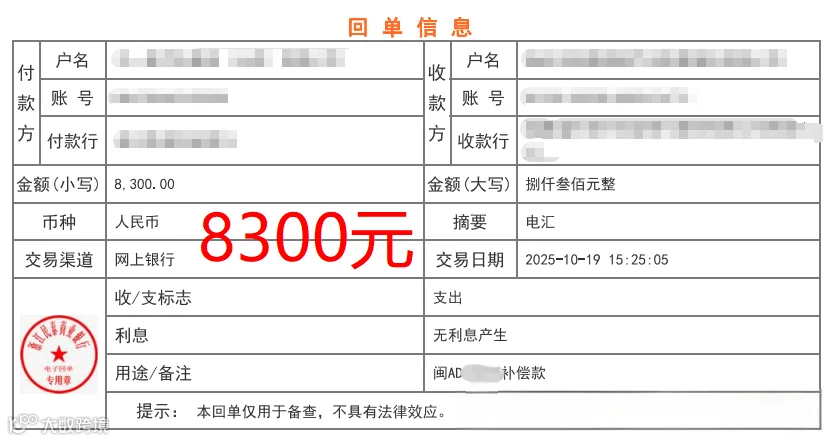 补偿金额:捌仟叁佰元整(小写:8300元)