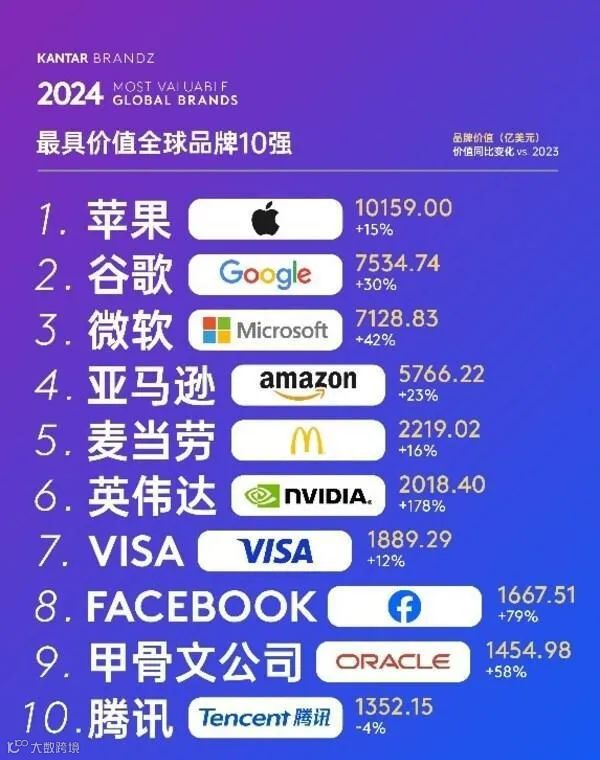 11个中国品牌上榜,分别为腾讯、茅台、阿里巴巴、抖音/TikTok、海尔、中国移动、中国工商银行、华为、平安、拼多多、农夫山泉。