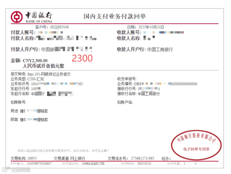 此次服务支出补偿款2300元。事故发生后,我司查勘人员提供专业服务,指导车主按流程处理,快速定损并及时打款,完美解决车主之所急,体现出亲情及关怀式补偿措施。